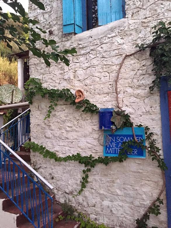 Κούκλες βιτρίνας που σαν πραγματικοί ένοικοι αυτού του χώρου κάθονται κάτω από την κληματαριά, στο μπαλκόνι και μέσα στο κτίριο.