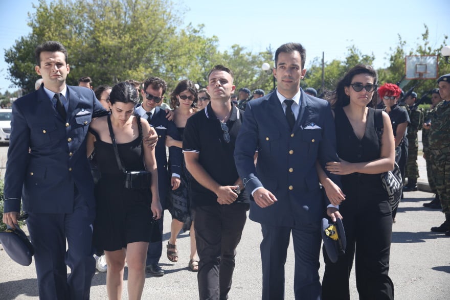 Τραγικές φιγούρες οι γονείς του και τα μέλη της οικογένειάς του, που έφτασαν στην εκκλησία κρατώντας στα χέρια δυο φωτογραφίες του γιου τους όπου απεικονίζεται εν ώρα πτήσης και με την επίσημη ενδυμασία του Σώματος.
