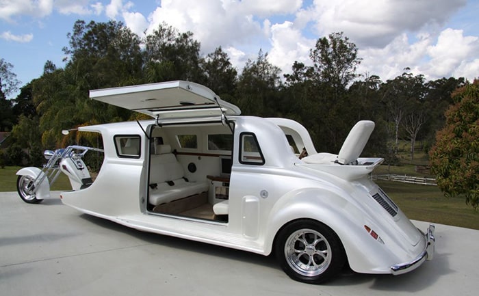 Ένα Boeing 727 λιμουζίνα. Αυτό το θηρίο 24.000 λιβρών είναι τοποθετημένο σε ένα σασί λεωφορείων Mercedes και χωράει εσάς και άλλους 49 φίλους σας. Διαθέτει καθιστικό με πίστα χορού, τηλεόραση με μεγάλη οθόνη, καθώς και ένα πλήρες μπαρ. Έχει μήκος 16 μέτρα.