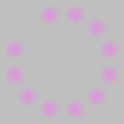 Κάθε ένα από τα 12 λιλά σημεία, εξαφανίζεται για περίπου 0,1 δευτερόλεπτα από έναν κύκλο που κινείται. Αν κοιτάξετε ακριβώς στον σταυρό, θα δείτε πρώτα το πράσινο σημείο και έπειτα τις λιλά κηλίδες να εξαφανίζονται.