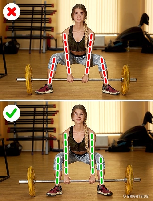 Σωστό: Βεβαιωθείτε ότι το βάρος της μπάρας βρίσκεται σε ευθεία με την μέση των ποδιών σας. Λυγίστε την πλάτη σας και μην σηκώστε τις φτέρνες από το πάτωμα. Κρατήστε τους μηρούς σας παράλληλα με το πάτωμα και μην κάνετε το κάθισμα πολύ βαθιά.