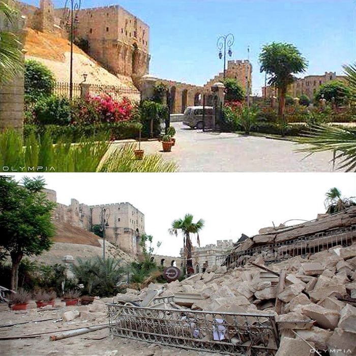Σε αυτές τις 27 φωτογραφίες που συγκρίνουν το πριν και το μετά στην μεγαλύτερη πόλη της Συρίας δείχνουν την τεράστια πολιτισμική καταστροφή που προκάλεσε ο πόλεμος. Ο φωτογράφος Hannah Karim δημιούργησε ένα θλιβερό πριν και μετά γνωστών σημείων της πόλης.