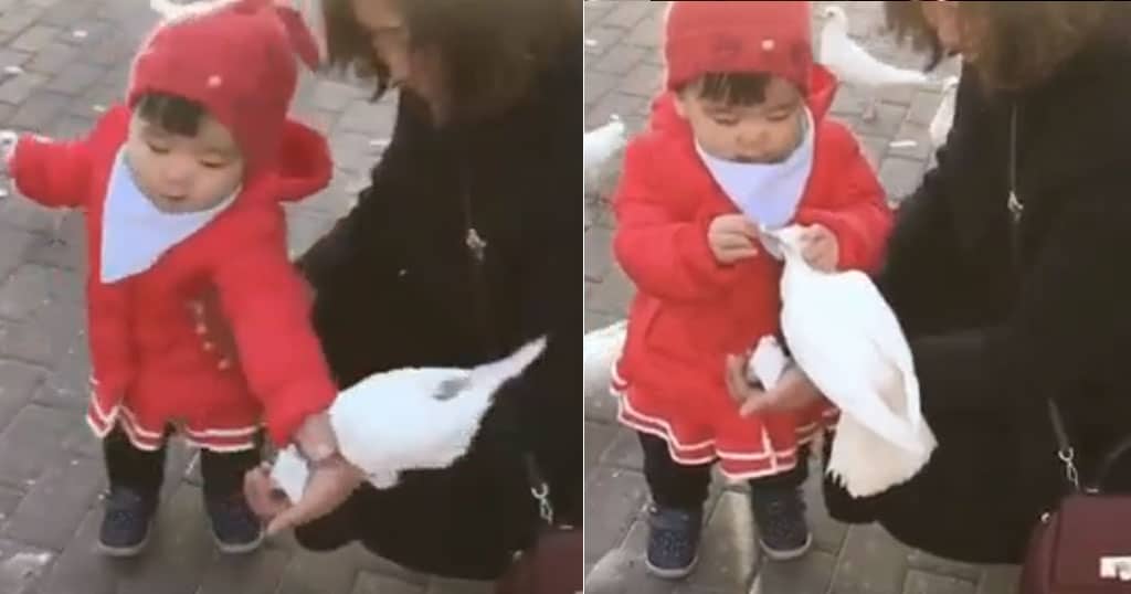 Το στιγμιότυπο προέρχεται από κάποια πολυσύχναστη πλατεία της Κίνας. Μια μητέρα με ένα κοριτσάκι, δύο, το πολύ τριών, ετών προσπαθούν να ταΐσουν περιστέρια. Οπως αποδεικνύεται μάλλον η μητέρα προσπαθεί να ταΐσει τα περιστέρια γιατί το κοριτσάκι είχε άλλο σκοπό.
