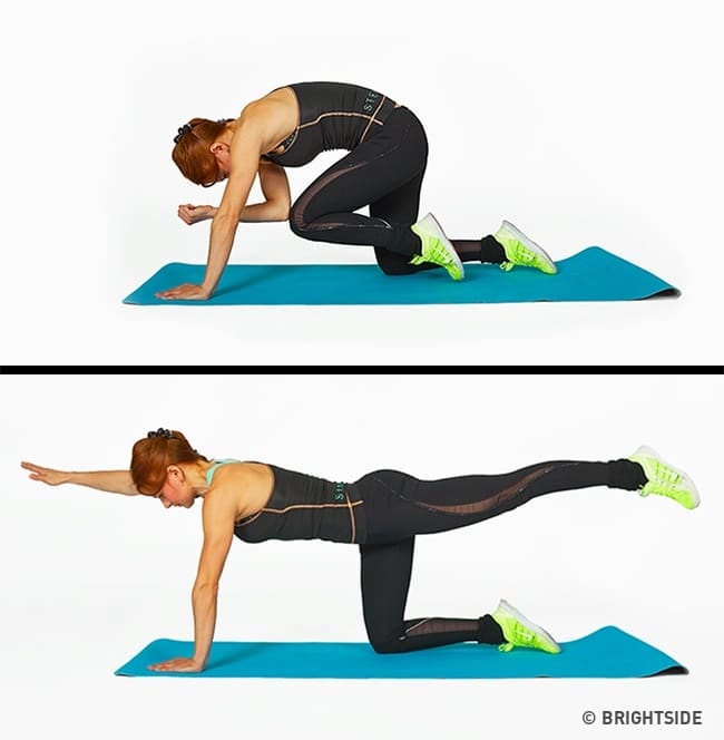 Πώς να την κάνετε: καθίστε στα τέσσερα και σηκώστε ταυτόχρονα το αριστερό πόδι και το δεξί χέρι σε ευθεία γραμμή. Στη συνέχεια, λυγίστε τα έτσι ώστε ο αγκώνας να ακουμπήσει το αριστερό γόνατο. Μετά, ξαναισιώστε και επαναλάβετε το ίδιο με το αντίθετο χέρι και πόδι.