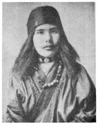 Αριστερά η εικονιζόμενη γυναίκα είναι από την φυλή των Αϊνώ, όπου φαίνονται και εις αυτήν τα μη ασιατικά χαρακτηριστικά, το ντύσιμο, και ότι να φορούν εις το κεφάλι τους ένα είδος στεφανιού ανάλογο με αυτό το οποίο φορούσαν οι πιστοί του Διονύσου κατά την διάρκεια των Διονυσιακών εορτών, δηλαδή στεφάνια από κισσό και άμπελο.