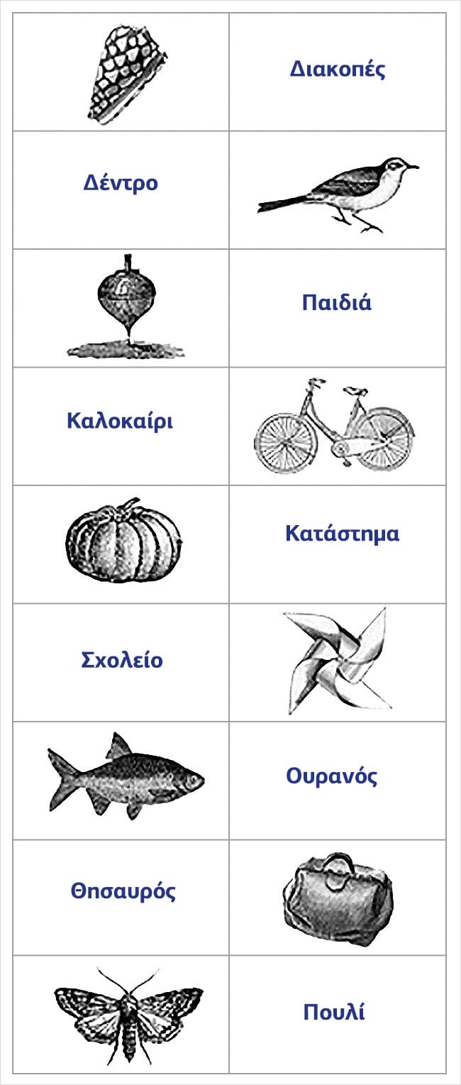 Προσπαθήστε να απομνημονεύσετε τα παρακάτω σετ εικόνων-λέξεων μέσα σε 30 δευτερόλεπτα. Τώρα, προσπαθήστε να τα γράψετε σε ένα χαρτί με την ίδια σειρά.