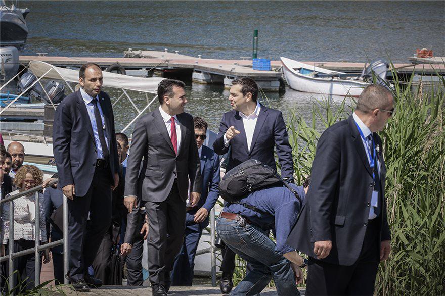 Ο πρωθυπουργός έφτασε στους Ψαράδες, μαζί με τον υπουργό Εξωτερικών Νίκο Κοτζιά, τον Μάθιου Νίμιτς, ειδικό απεσταλμένο του γενικού γραμματέα του ΟΗΕ Αντόνιο Γκουτέρες, την αντιπρόεδρο της Ευρωπαϊκής Επιτροπής και Ύπατη Εκπρόσωπο της ΕΕ, Φεντερίκα Μογκερίνι, τον επίτροπο της ΕΕ αρμόδιο για τη Διεύρυνση, Γιοχάνες Χαν και την Ροζμαρί Ντι Κάρλο, εκπρόσωπο του γενικού γραμματέα του ΟΗΕ Αντόνιο Γκουτέρες, αναπληρώτρια γ.γ. για Πολιτικές Υποθέσεις. Ο Ζόραν Ζάεφ έφτασε με σκάφος μέσω της λίμνης μαζί με τον υπουργό Εξωτερικών Νίκολα Ντιμιτρόφ. Μάλιστα τράβηξε και σέλφι μέσα από το σκάφος! Η υποδοχή έγινε στη μαρίνα και αμέσως μετά με τον Αλέξη Τσίπρα μετέβησαν πεζή, σε απόσταση λίγων μέτρων, στη διαμορφωμένη εξέδρα.