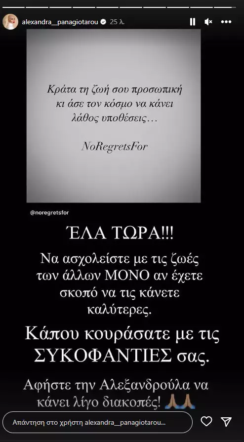 Σήμερα, Κυριακή 4 Ιουνίου η Αλεξάνδρα Παναγιώταρου ξέσπασε μέσα από τον προσωπικό της λογαριασμό στο instagram: «Έλα τώρα!!! Να ασχολείστε με τις ζωές των άλλων μόνο αν έχετε σκοπό να τις κάνετε καλύτερες. Κάπου κουράσατε με τις συκοφαντίες σας. Αφήστε την Αλεξανδρούλα να κάνει λίγο διακοπές», ήταν η οργισμένη ανάρτηση, μιας και η ίδια απολαμβάνει τις διακοπές της στη Μύκονο.