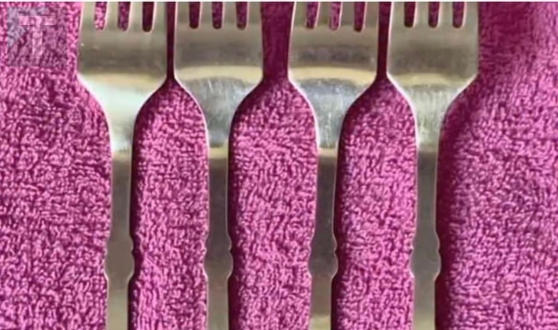 Πρόκειται για 5 πιρούνια που είναι τοποθετημένα πάνω σε μια ροζ πετσέτα.