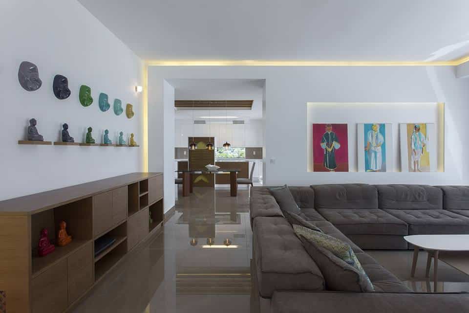 Τα μεγάλα ανοίγματα στο ισόγειο και τον όροφο διατηρούν την αίσθηση του ανοιχτού χώρου και σε όλο το εσωτερικό της κατοικίας.