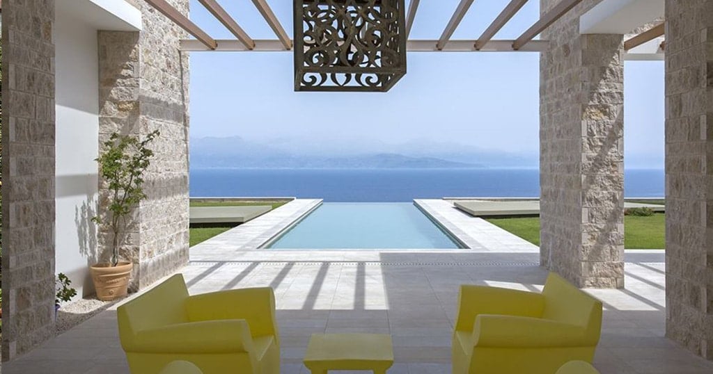 Το ίδιο μάρμαρο έχει επενδύσει γραμμικά την “πλατεία” πριν την είσοδο και το patio, ενώ στη συνέχεια εισχωρεί στην πισίνα καταλήγοντας σε καταρράκτη στο τελείωμα της προς το μέρος της θάλασσας.