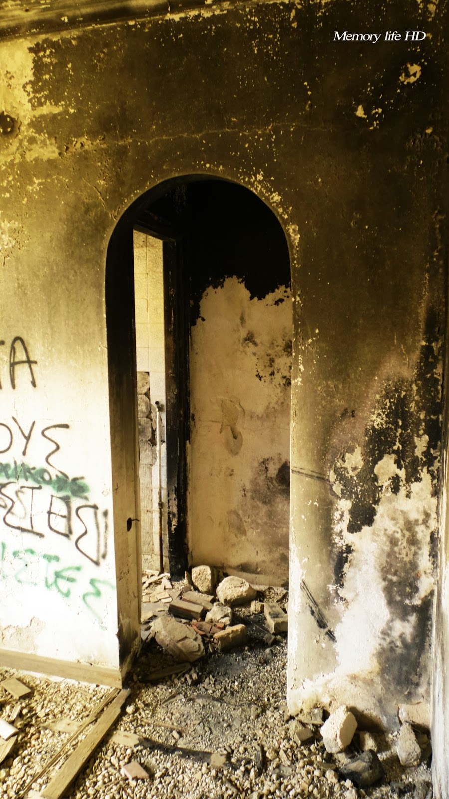 Σημάδια πυρκαγιάς σε αρκετούς τοίχους  του ισογείου.