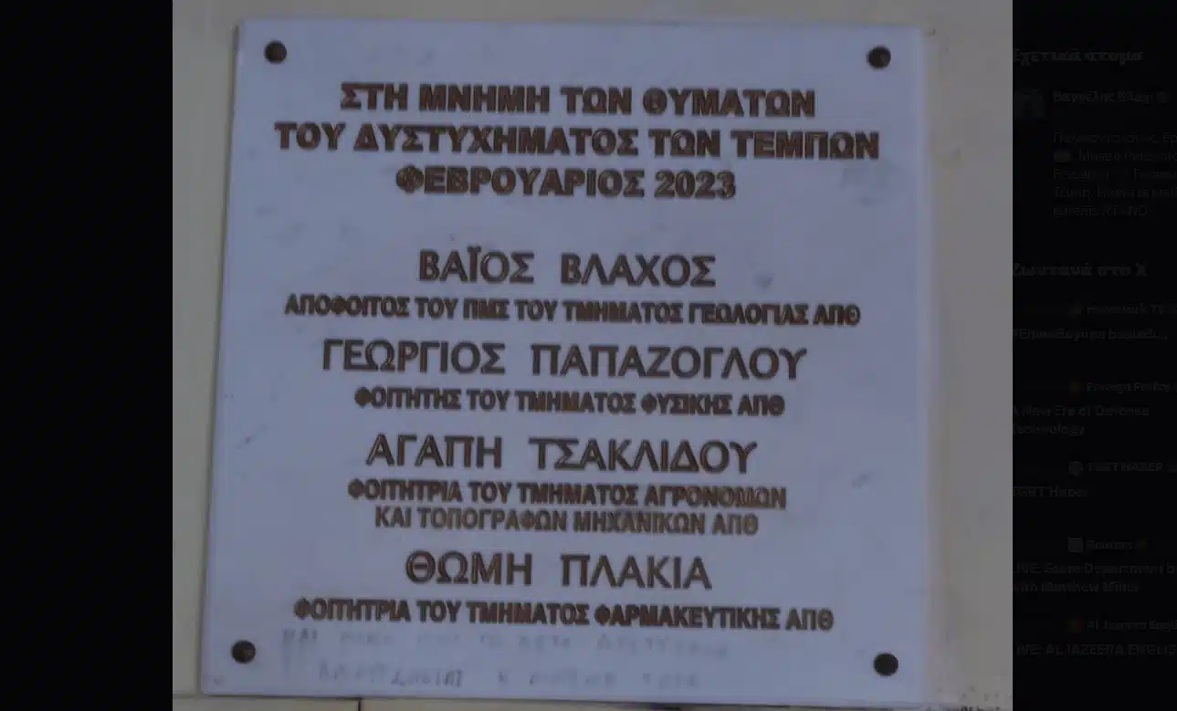 Το Αριστοτέλειο Πανεπιστήμιο Θεσσαλονίκης (ΑΠΘ) έφτιαξε μία πλάκα για να τιμήσει τη μνήμη τεσσάρων φοιτητών που έχασαν τη ζωή τους στο δυστύχημα των Τεμπών. Συγκεκριμένα η πλάκα αφορά τον Βάιο Βλάχο, τον Γιώργο Παπάζογλου, την Αγάπη Τσακλίδου και τη Θώμη Πλακιά.
