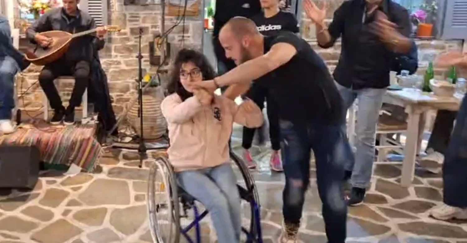 Συγκινητικές στιγμές εκτυλίχθηκαν στο γλέντι για τα γενέθλια της Αργυρώς, μιας κοπέλας από το χωριό Θολάρια, στην Αμοργό, η οποία χόρεψε «μπάλο» καθισμένη στο αναπηρικό της αμαξίδιο με τη βοήθεια ενός φίλου της.