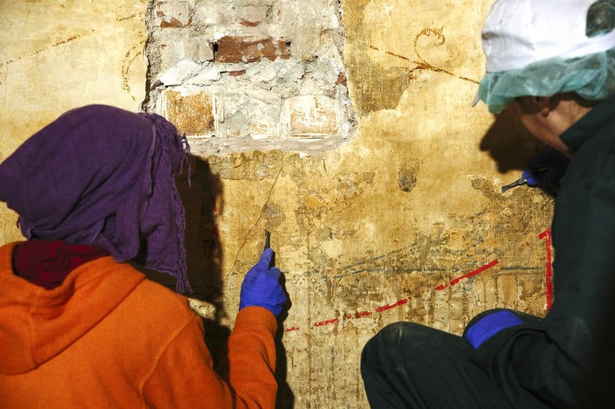 Όπως αντιλαμβάνεστε, τα χώματα είναι ασταθή και τα χρώματα ξεπερνούν τα 120 έτη. Άρα, σε πολλά σημεία ο σοβάς είναι αποκολλημένος και ανά πάσα στιγμή ελλοχεύει ο κίνδυνος της κατάρρευσης. Αφού γίνουν όλα αυτά, προχωράμε στην αισθητική αποκατάσταση με διακριτό τρόπο και σύμφωνα με τις οδηγίες της διεύθυνσης αρχαιοτήτων και μνημείων.