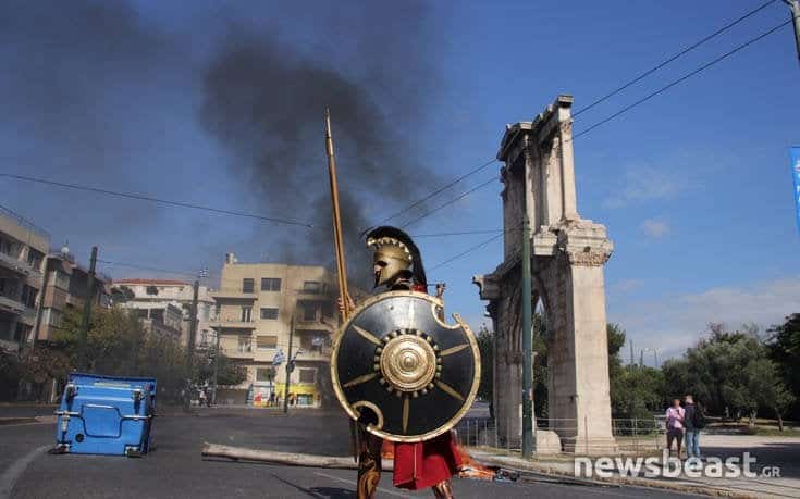 Ενώ υπήρχαν ανταλλαγές αντικειμένων, φωτιές και χημικά, ένας άνδρας ντυμένος με αρχαιοελληνική στολή έκανε την εμφάνισή του, περνώντας ανάμεσα από τις αστυνομικές δυνάμεις με… την ασπίδα και το δόρυ του.