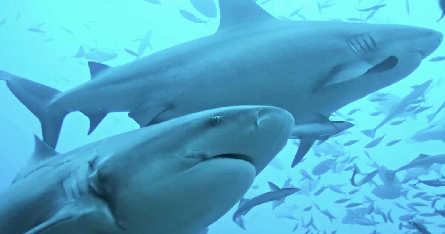 Το βίντεο δείχνει τους καρχαρίες να κολυμπούν ατάραχοι κοντά στο αλιευτικό σκάφος χωρίς φόβο και απειλητικές διαθέσεις.