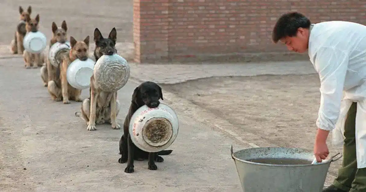 Αυτοί οι αστυνομικοί σκύλοι στην Κίνα δείχνουν αξιοσημείωτη πειθαρχία, περιμένοντας στη σειρά για φαγητό, με το σκεύος τους στο στόμα.