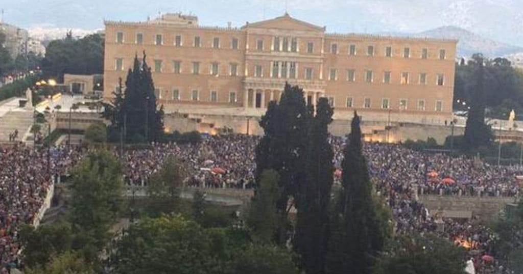Tο κάλεσμα είχε οριστεί για τις 19:30 στη Βουλή των Ελλήνων και πλήθος πολιτών κρατώντας πανό με συνθήματα και ελληνικές σημαίες έχει ήδη κατακλύσει το κέντρο της ελληνικής πρωτεύουσας.