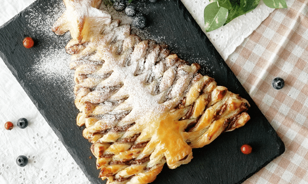 Κόψτε τη ζύμη σε μορφή χριστουγεννιάτικου δέντρου (τρίγωνο) και τοποθετήστε τη σε αντικολλητικό ταψί. Απλώστε τη nutella και πασπαλίστε με τα αμύγδαλα. Τοποθετήστε το δεύτερο φύλλο από πάνω και χαράξτε και τις δύο πλευρές αποφεύγοντας αφήνοντας το κέντρο του φύλλου άθικτο.
