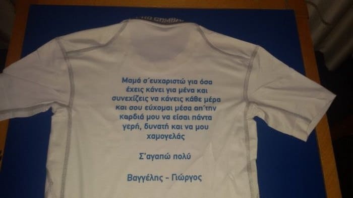 «Όχι. Ο μικρός μέχρι την Β´ Δημοτικού ήταν αρτιμελής. Τότε ξεκίνησε η ασθένεια του με αποτέλεσμα τώρα που πηγαίνει στην ΣΤ΄ Δημοτικού να μην μπορεί να γράψει. Δυσκολεύεται αρκετά, αλλά το παλεύει. Πάει και κολυμβητήριο. Μάλιστα, στις μπλούζες που φορούσαμε του ζήτησα αν ήθελε να γράψουμε κάτι πίσω ως μήνυμα. Επειδή δεν μπορούσε να το γράψει ζήτησε από τους συμμαθητές του να τον βοηθήσουν. Το μήνυμα που ζήτησε και το έβλεπαν όσοι μας προσπερνούσαν ήταν: «Μαμά σ΄ ευχαριστώ για όσα έχεις κάνει για μένα και συνεχίζεις να κάνεις κάθε μέρα και σου εύχομαι μέσα απ΄ την καρδιά μου να είσαι πάντα γερή, δυνατή και να μου χαμογελάς. Σ΄ αγαπώ πολύ. Βαγγέλης – Γιώργος»».