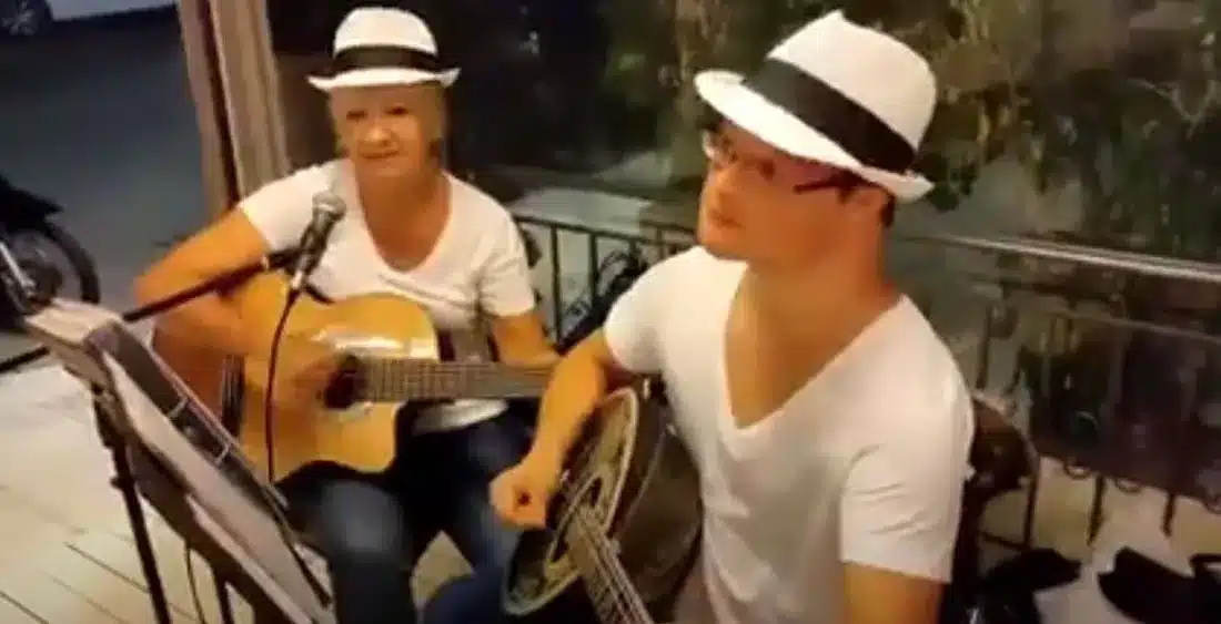 Ο Κυριάκος Φριλίγκος παίζει με το μπουζούκι του, το ζεϊμπέκικο της Ευδοκίας” και τον συνοδεύει στην κιθάρα η μητέρα του Μαργαρίτα Φριλίγκου.