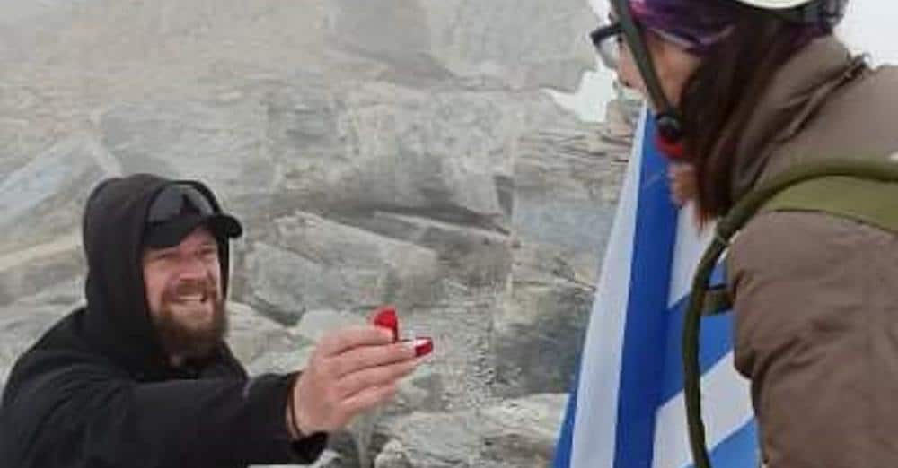 Ο Θανάσης Τσαγγαδούρας κρεοπώλης από την Καρυδίτσα Κοζάνης κάνει πρόταση γάμου στα 2.918 μέτρα στην Ελισάβετ Μάμαλη. Στον Όλυμπο όλα αυτά…μετά από ανάβαση για εκδρομούλα
