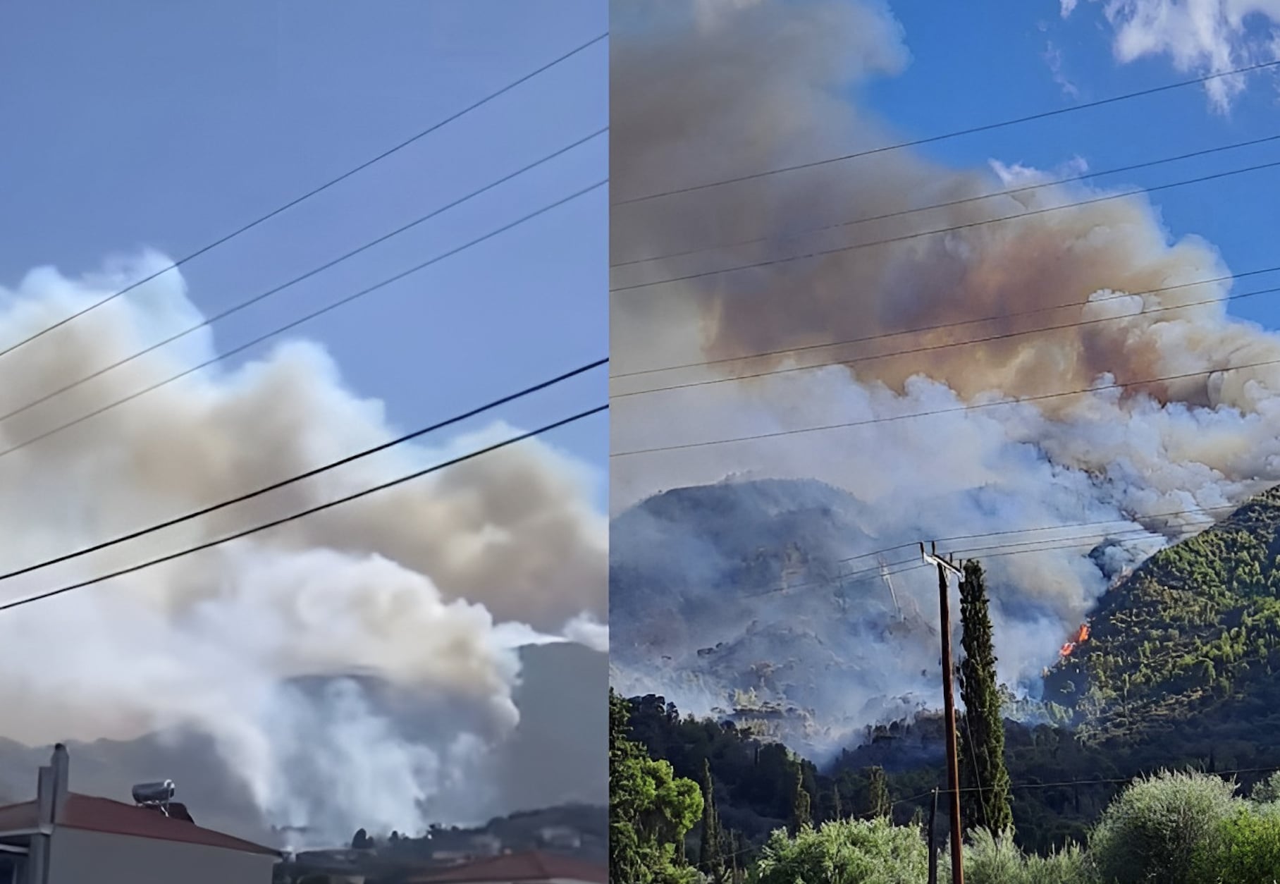 Λόγω των ισχυρών ανέμων, του πυκνού δάσους και τους δύσβατου της περιοχή η φωτιά μαίνεται εκτός ελέγχου και απειλεί δύο χωριά.