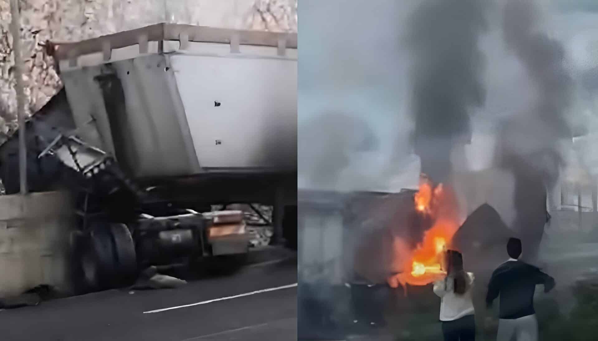 Από τη σφοδρή πρόσκρουση ο οδηγός του, ένας άνδρας 60 περίπου ετών, εγκλωβίστηκε στην καμπίνα του οχήματος, το οποίο γρήγορα τυλίχθηκε στις φλόγες.