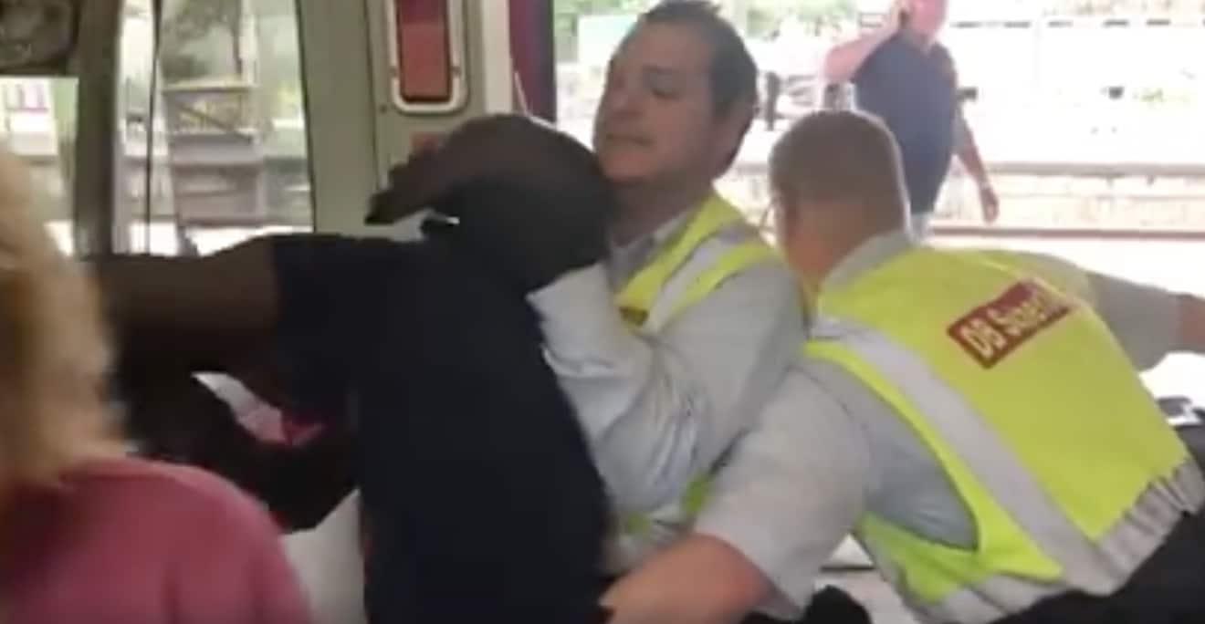 Τελικά καταφέρνουν να τον πετάξουν έξω από το βαγόνι και στη συνέχεια πέφτουν επάνω του και τον ακινητοποιούν, ενώ οι επιβάτες ακούγονται να επιπλήττουν τους άντρες της ασφάλειας.