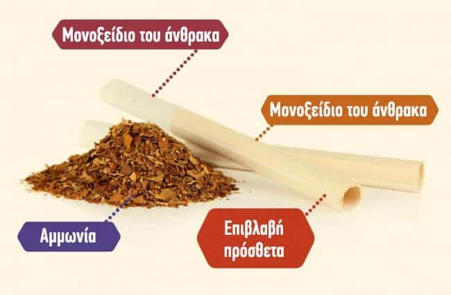 Αυτό που έχουμε συνηθίσει να αποκαλούμε τσιγάρο ονομάζεται “σύστημα παράδοσης νικοτίνης” στην καπνοβιομηχανία και τον Παγκόσμιο Οργανισμό Υγείας. Η νικοτίνη, το μονοξείδιο του άνθρακα, η ακετόνη, το μεθάνιο, το αρσενικό και το πολώνιο είναι μερικά από τα συστατικά του τσιγάρου. Οι ερευνητές υπολόγισαν ότι ο καπνός των τσιγάρων περιέχει 7.357 χημικές ενώσεις διαφορετικών ομάδων.