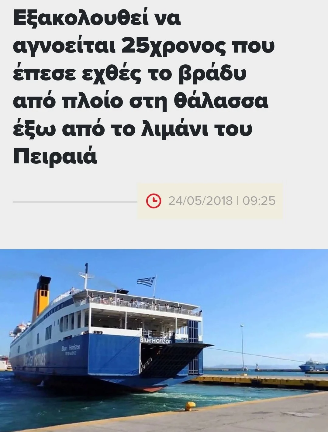 Όπως υπογραμμίζεται σε σχετικό δημοσίευμα «Κανένα ίχνος ζωής δεν υπάρχει για έναν 25χρονο άνδρα που έπεσε στη θάλασσα χθες το βράδυ από το “Blue Horizon”, λίγα μόλις λεπτά μετά την αναχώρησή του από το λιμάνι του Πειραιά με προορισμό το Ηράκλειο.