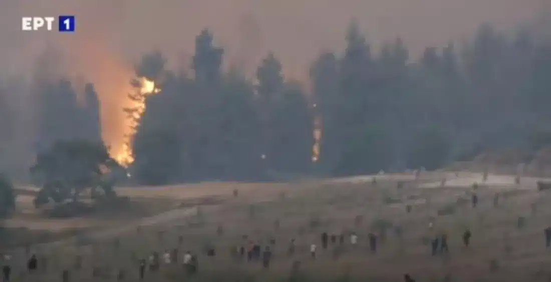 Τη στιγμή που οι πύρινες φλόγες καίνε ένα “τείχος” από πεύκα, οι κάτοικοι παίρνουν θέση σε έναν ελαιώνα και οργανώνονται, προκειμένου να δώσουν μάχη, ώστε να ανακόψουν την πορεία του πύρινου μετώπου. Αυτά συνέβησαν λίγο πριν πέσει το σκοτάδι και σταματήσουν να επιχειρούν τα εναέρια μέσα.
