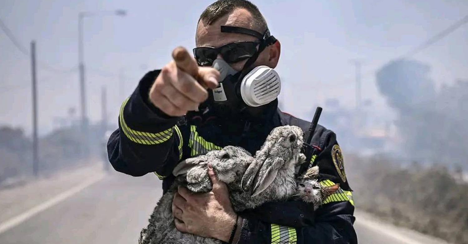 Φωτιά στη Ρόδο: Πυροσβέστης κρατά αγκαλιά δύο λαγουδάκια και ένα γατάκι που διέσωσε από τις φλόγες