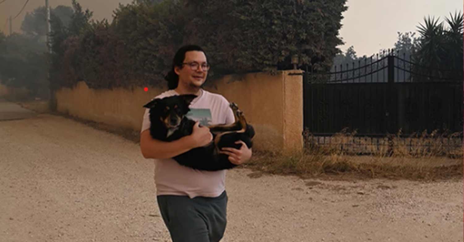 Η κάμερα του Newsbeast κατέγραψε την προσπάθεια κατοίκου του Λαγονησίου να φύγει γρήγορα από το σημείο έχοντας στην αγκαλιά του έναν σκύλο. Το μαύρο σκυλάκι, φοβισμένο προσπαθούσε να καταλάβει τι συμβαίνει γύρω του. Χωρίς να «διαμαρτύρεται», ο νεαρός το απομάκρυνε από τη φωτιά προκειμένου να μεταφερθεί και εκείνο σε ασφαλές σημείο.