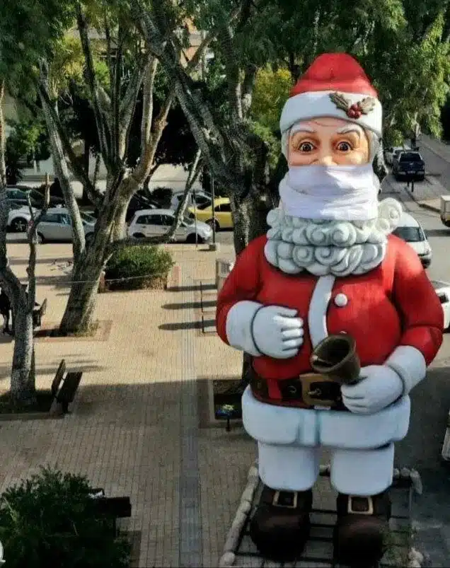 Μια άλλη καινοτομία είναι ότι ο συγκεκριμένος Αη Βασίλης φορά μάσκα – πλήρως προσαρμοσμένος στο πνεύμα των ημερών και στις ανάγκες ατομικής προστασίας που επιβάλλει η πανδημία.