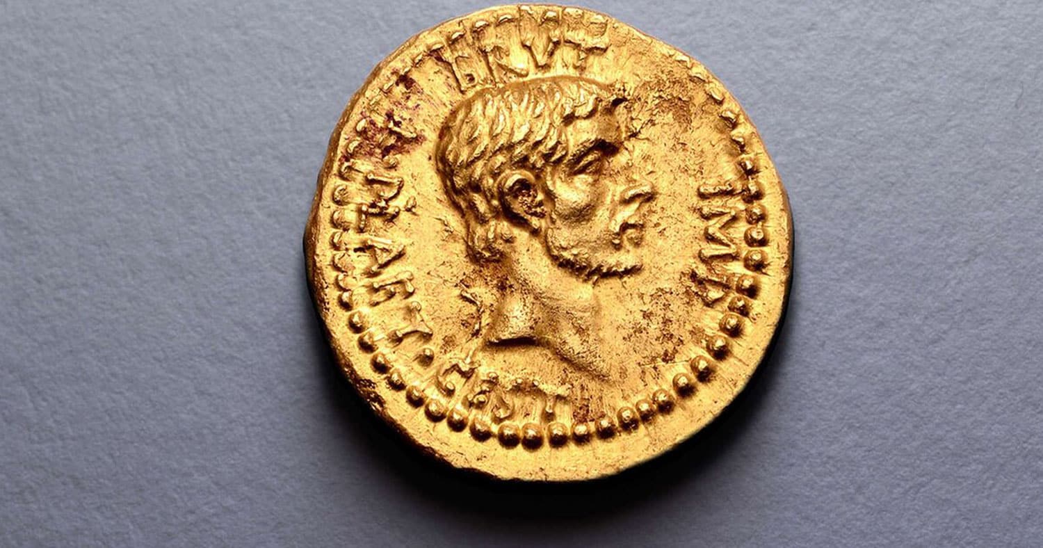 Μόνο ένα από τα τρία του είδους του που είναι γνωστό ότι υπάρχουν ακόμη, το νόμισμα περιλαμβάνει το πορτρέτο του Ρωμαίου πολιτικού Μάρκου Ιούνιου Βρούτου, ο οποίος ως γνωστόν βοήθησε στην ενορχήστρωση της δολοφονίας του Καίσαρα το 44 π.Χ., καθώς και απεικονίσεις των μαχαιριών που χρησιμοποιήθηκαν για τη δολοφονία του.