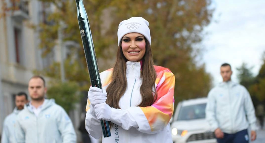 Η πρέσβης, φορώντας την ειδική στολή της λαμπαδηδρομίας με σκούφο και γάντια, παρέλαβε τη Φλόγα μπροστά από το Μουσείο της Ακρόπολης, στη Διονυσίου Αρεοπαγίτου