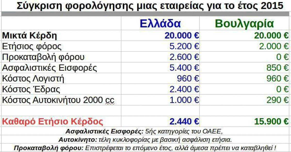 Οι επαΐοντες όμως, υπόσχονται φορολογικές απαλλαγές χωρίς να μεταφερθούν οι δραστηριότητες στη Βουλγαρία. Προτείνουν την ίδρυση μιας «εταιρείας σφραγίδα» η οποία δεν θα έχει γραφεία, προσωπικό και φυσικά καμιά δραστηριότητα, πλην της τιμολόγησης και μεταφοράς ανύπαρκτου κόστους στην Ελλάδα.