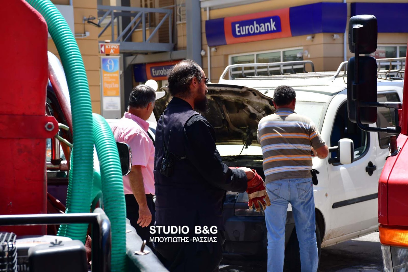 Ένα ΙΧ αυτοκίνητο τυλίχθηκε στις φλόγες με πυκνούς καπνούς να βγαίνουν από το χώρο της μηχανής του στο κέντρο της πόλης του Ναυπλίου την Πέμπτη 5 Ιουλίου στις 12:20 το μεσημέρι.