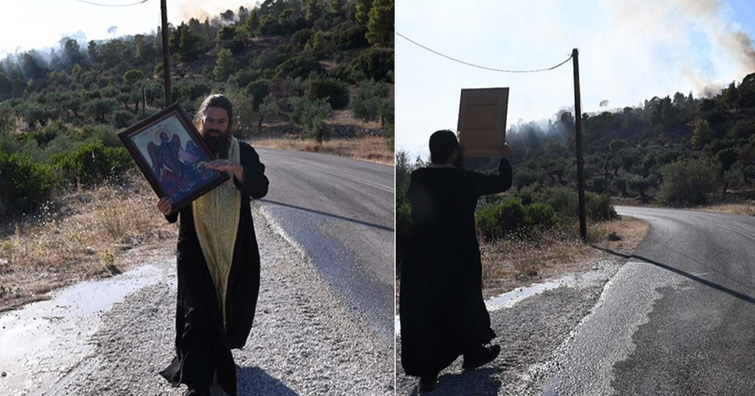 Όπως φαίνεται και στα φωτογραφικά στιγμιότυπα, ο παπάς ο οποίος λειτουργεί στο εκκλησάκι του Προφήτη Ηλία γυρνά στους δρόμους της περιοχής με μια εικόνα στα χέρια ενώ προσεύχεται να σβήσει η πυρκαγιά.