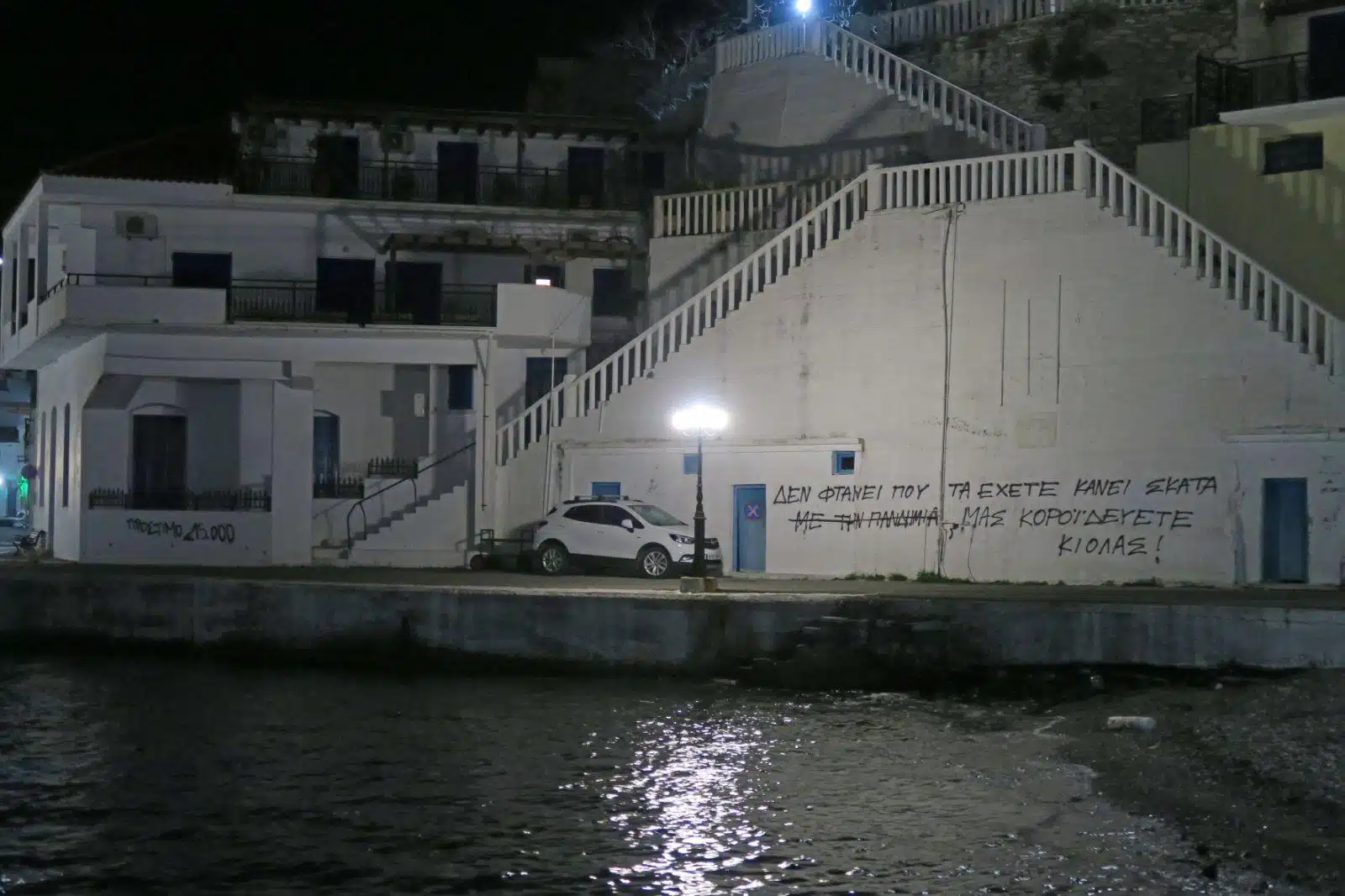 Συνθήματα στο σπίτι του βουλευτή της Ν.Δ. Στεφανάδη στην Ικαρία .Τα συνθήματα ¨πρόστιμο 15.000” και “Δεν φτανει που τα έχετε κάνει σκατά με την πανδημία  μας κοροιδεύετε κιόλας “κοσμούσαν το σπίτι που φιλοξένησε τον Μητσοτάκη μαζί με τον εισαγόμενο και ντόπιο τσαρλατανοσυρφετό του .Ωρες μετά σβηστήκαν απο συνεργεία του “ακομάτιστου” Δήμου Ικαρίας.Φιλόξενοι Καριώτες