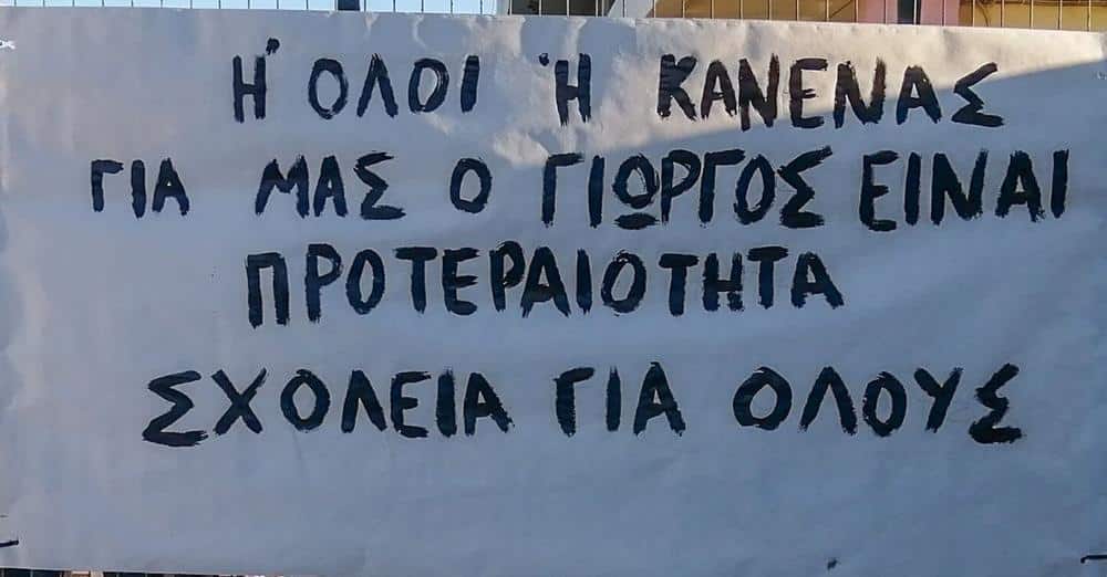 Ενωμένοι σαν μια γροθιά οι μαθητές έκαναν το αυτονόητο για να υπερασπιστούν το συμμαθητή τους. Το πανό που κρέμασαν στο σχολείο γράφοντας “Ή όλοι ή κανένας, για μας ο Γιώργος είναι προτεραιότητα. Σχολεία για όλους” είναι η έκφραση της μαθητικής αλληλεγγύης.