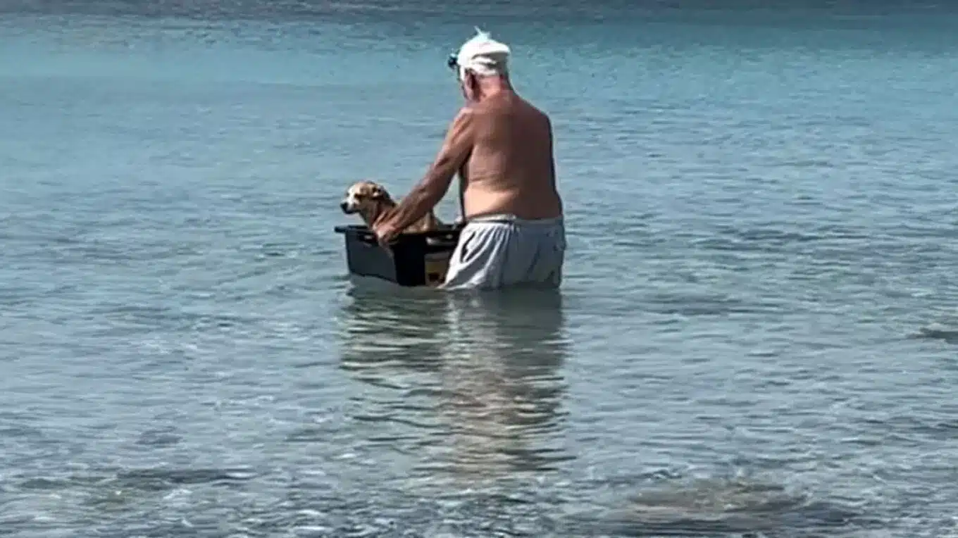 Σε βίντεο που αναρτήθηκε στο Tik Tok φαίνεται ο ηλικιωμένος κύριος να έχει πάρει μαζί του στη θάλασσα τον σκύλο του.