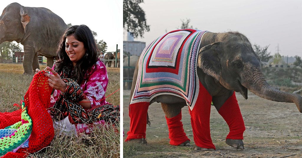Οι χειμώνες είναι πολύ ψυχροί στην βόρεια Ινδία, οπότε οι εθελοντές του Κέντρου Φροντίδας και Διατήρησης Ελεφάντων αποφάσισαν να πλέξουν τεράστια πουλόβερ για να προστατέψουν τους ελέφαντες από το κρύο.