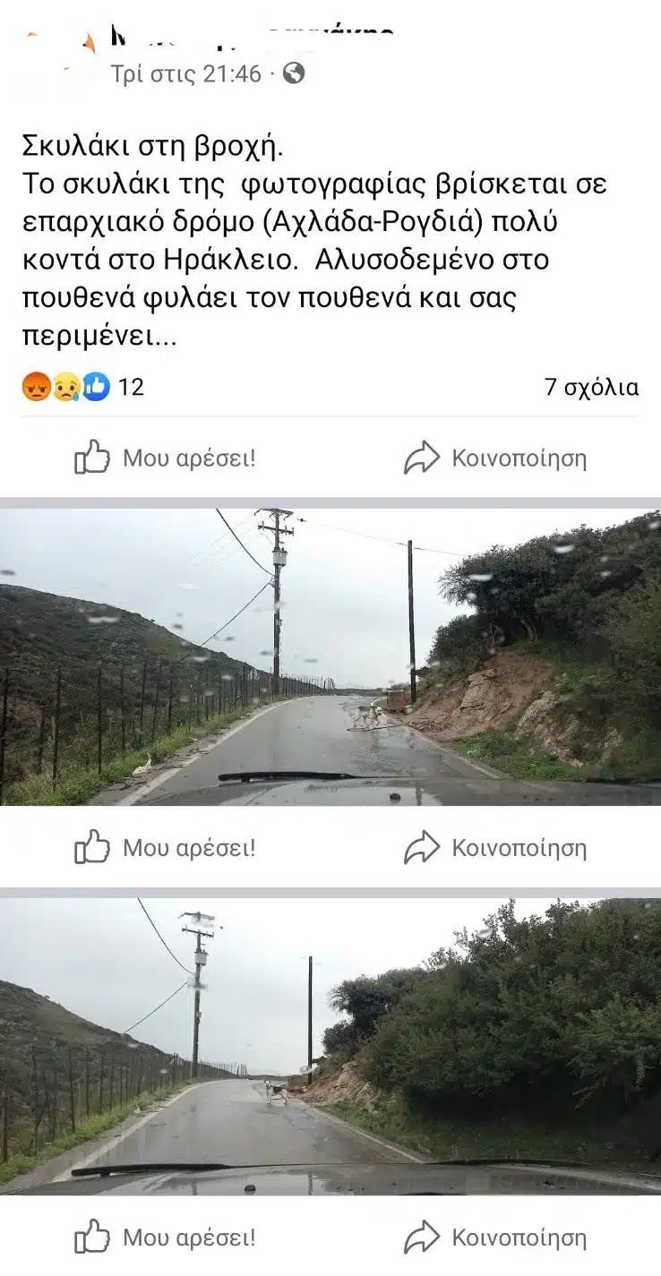Ο αυτόπτης μάρτυρας – που τράβηξε και τις φωτογραφίες – στις 31 Ιανουαρίου με ανάρτηση του στο facebook είχε επισημάνει τα εξής: «Σκυλάκι στη βροχή. Το σκυλάκι της φωτογραφίας βρίσκεται σε επαρχιακό δρόμο (Αχλάδα – Ρογδιά) πολύ κοντά στο Ηράκλειο. Αλυσοδεμένο στο πουθενά φυλάει τον πουθενά και σας περιμένει…».