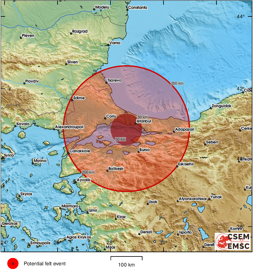 Σεισμός σημειώθηκε στην Τουρκία το μεσημέρι της Πέμπτης 02/10/2025, στη θαλάσσια περιοχή του Μαρμαρά, κοντά στην Κωνσταντινούπολη. Σύμφωνα με το Ευρωμεσογειακό Σεισμολογικό Κέντρο, η δόνηση είχε μέγεθος 5,2 Ρίχτερ και έγινε ιδιαίτερα αισθητή στην Κωνσταντινούπολη αλλά και σε πολλές πόλεις της βορειοδυτικής Τουρκίας.