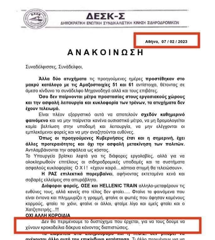 Η Δημοκρατική Ενωτική Συνδικαλιστική Κίνηση Σιδηροδρομικών υπαλλήλων είχε προειδοποιήσει σε ανακοίνωσή της πριν λίγες εβδομάδες για το τραγικό δυστύχημα που ήταν θέμα χρόνου να γίνει και δυστυχώς οι φόβοι και οι προβλέψεις της βγήκαν αληθινές μετά τη σύγκρουση των τρένων στα Τέμπη που άφησε δεκάδες νεκρούς και τραυματίες.