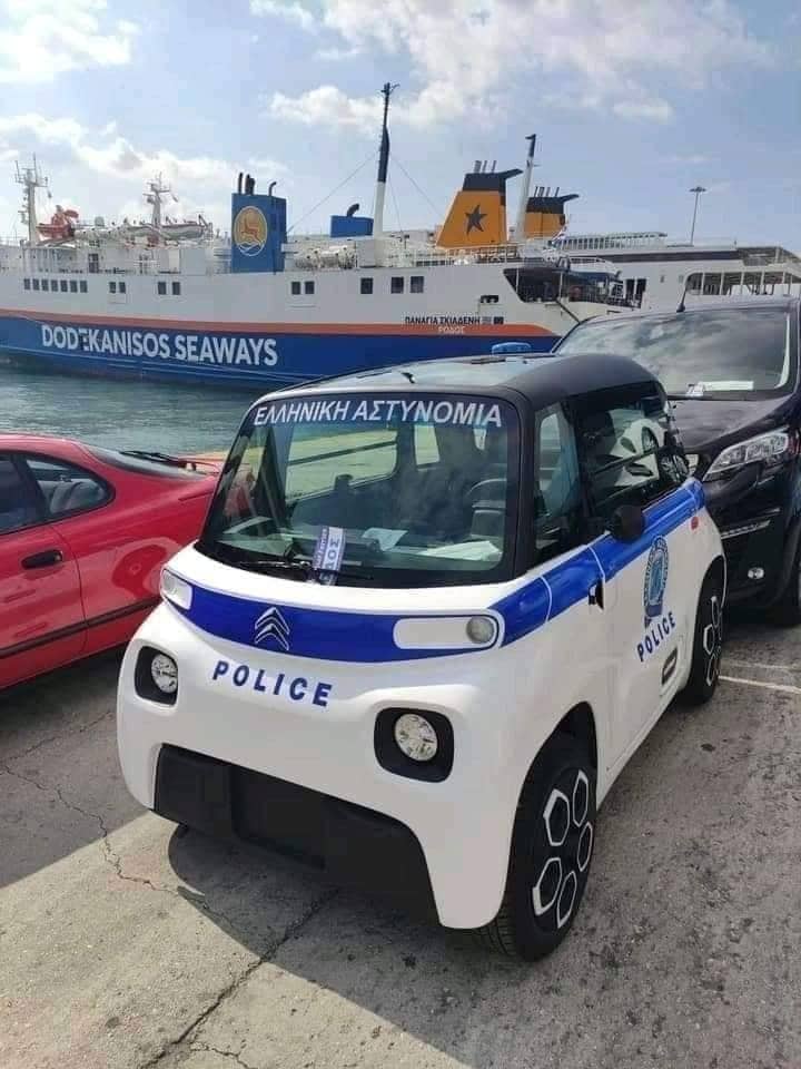 Πράγματι όταν βλέπεις ένα τέτοιο περιπολικό, δεν μπορείς παρά τουλάχιστον να χαμογελάσεις. Όμως, η χρήση τους είναι πολύ συγκεκριμένη. Πρόκειται για ηλεκτρικά, μίνι περιπολικά που θα κυκλοφορούν στη Χάλκη, στο πλαίσιο της «πράσινης» μετατροπής του νησιού.