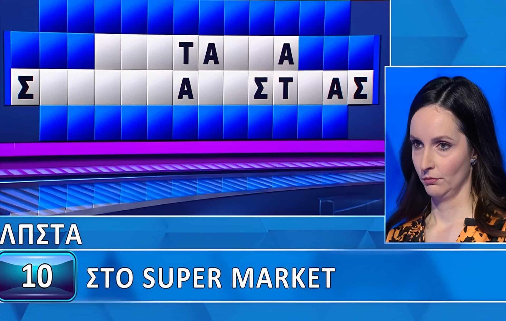 Ο γρίφος είχε να κάνει με «σούπερ μάρκετ» και έτσι της δόθηκαν, όπως ορίζουν οι κανόνες του παιχνιδιού, κάποια σύμφωνα και φωνήεν, για να καταφέρει να μαντέψει τις δύο λέξεις του γρίφου.